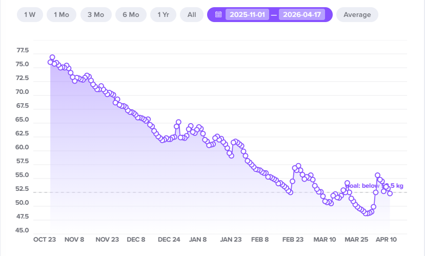 Before breakfast weigh-in: 51.5 kg / 113.5 lbs / 17.2 bmi