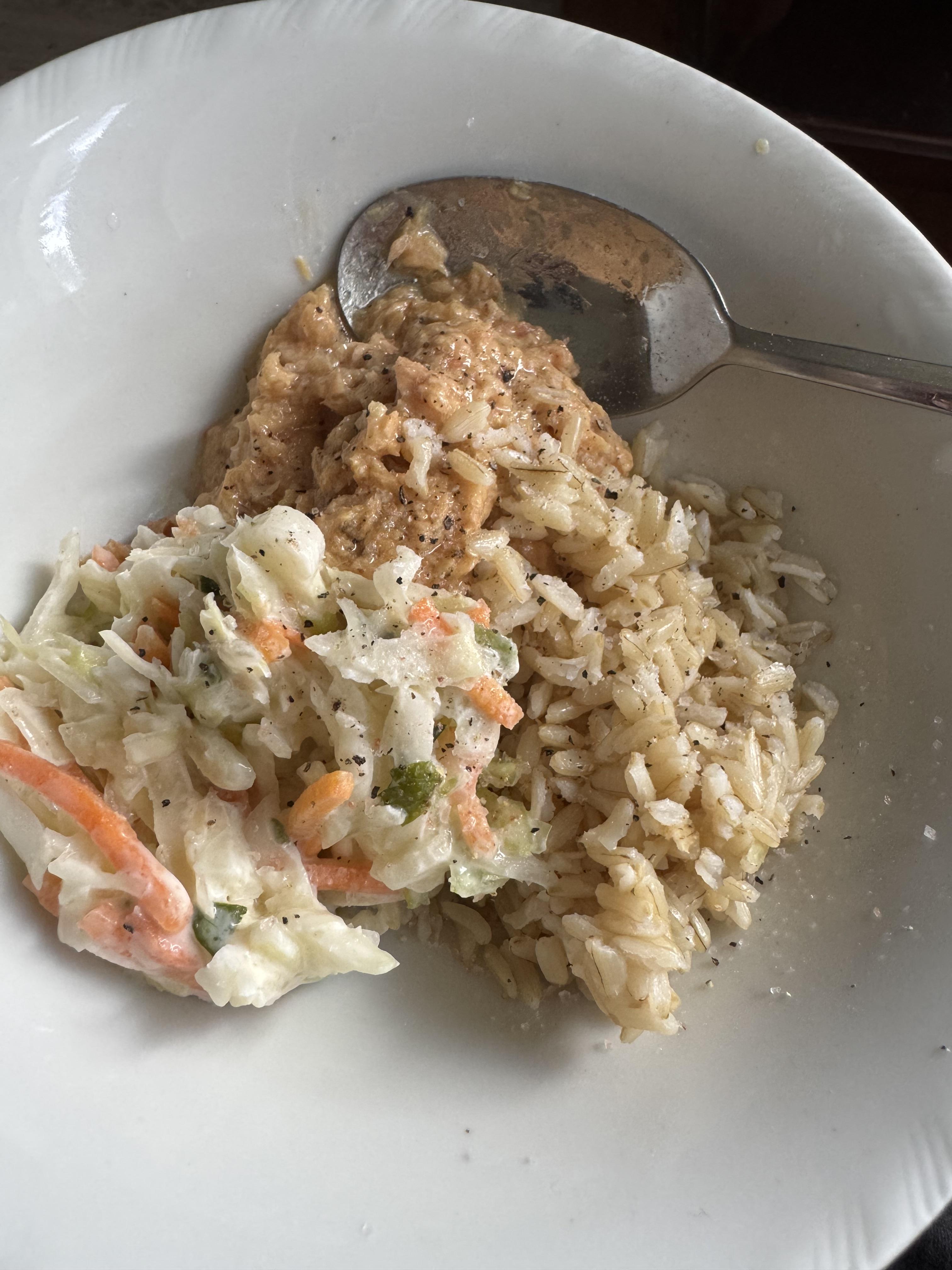my meals for the day. 5 bites and throw the rest1. coleslaw, rice and mustard salmon