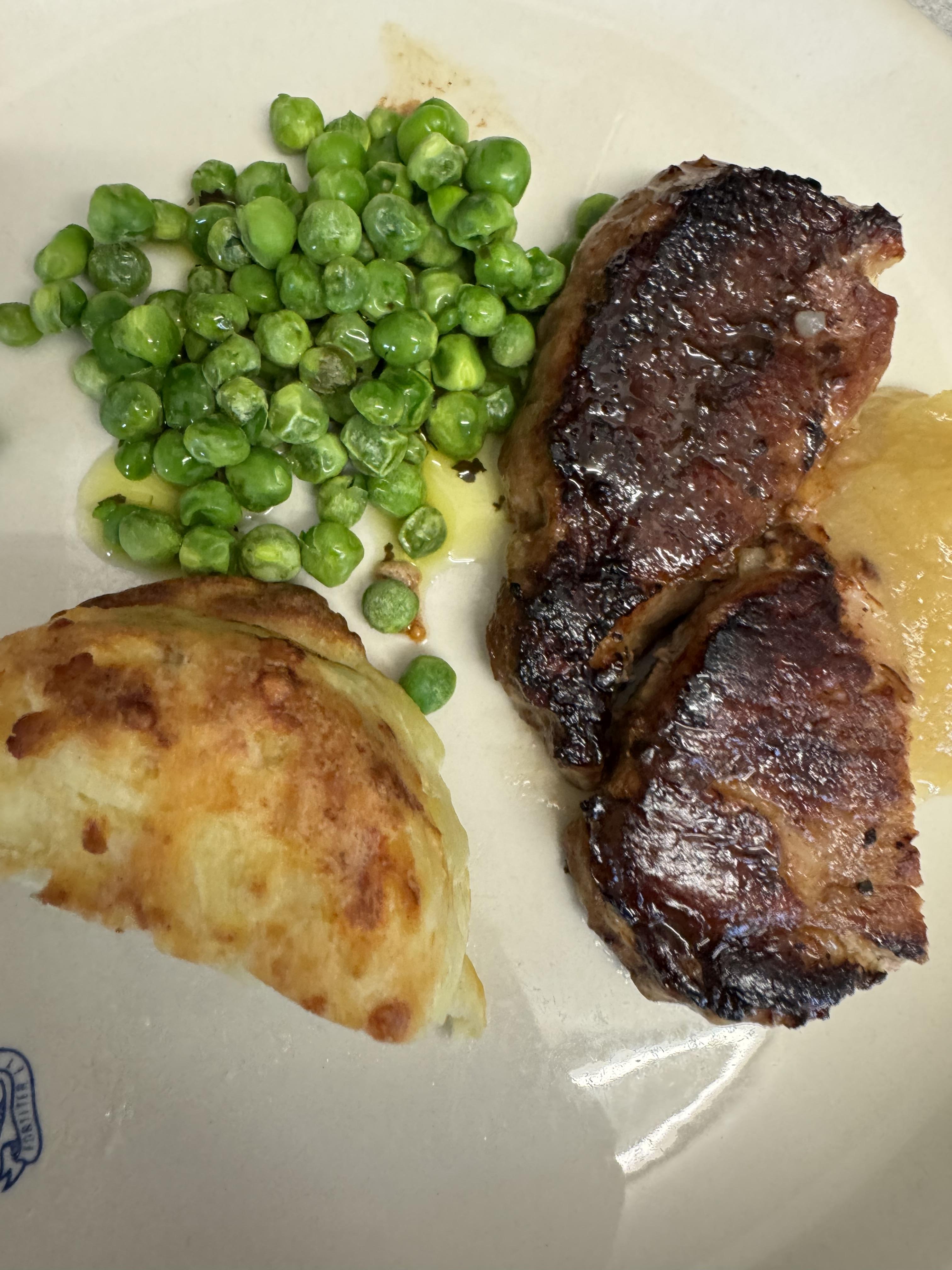 2. Honey pepper pork, peas and potato gratin, mint sauce and apple sauce