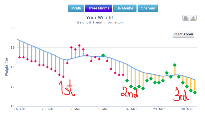 Here is an illustration of my first, second, and third attempt at a smooth and balanced glide into maintenance.
