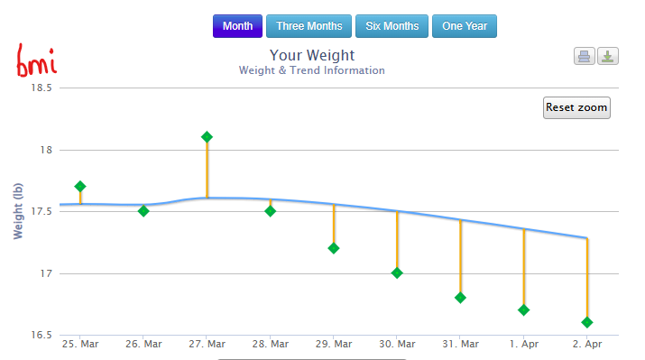 This morninng my weight has again dropped a little: 49.9 kg / 110 lbs / 16.7 bmi.